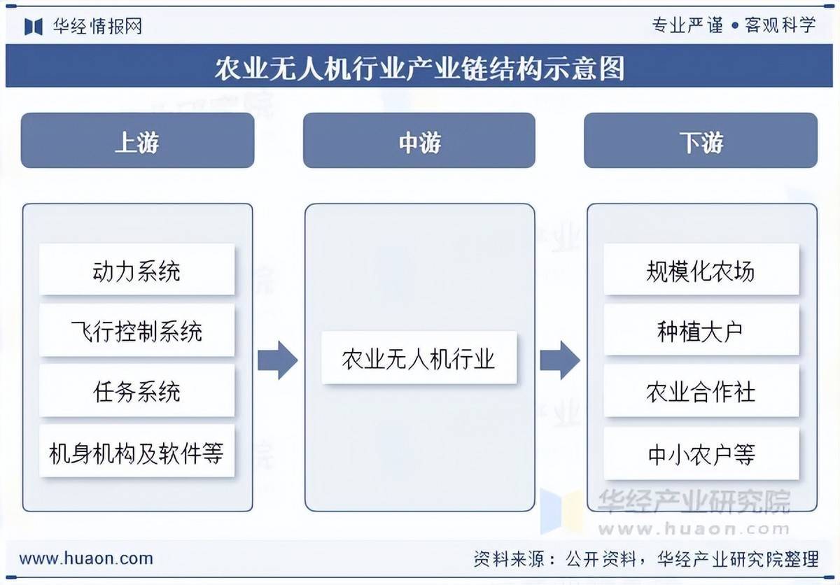 农业无人机行业产业链上游包括动力系统、飞行控制系统、任务系统、机身机构与软件、技术提供商等,其中动力系统包括电池、电机、电调、螺旋桨等;飞行控制系统包括包括主控器、IMU、GPS/RTK模块、气压计等;任务系统包括喷洒系统(药箱、水泵、喷头)、播撒系统(种箱、排料器)等;机身系统包括碳纤维复合材料、工程塑料、铝合金等材料。中游为农业无人机研发、制造与服务商。下游终端用户包括规模化农场、种植大户、农业合作社、中小农户等。